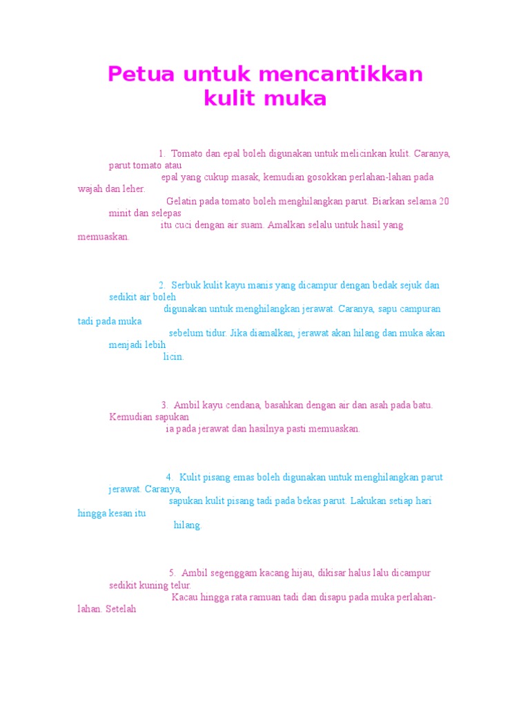 Setelah mengamalkan cara penjagaan kulit muka dengan betul, anda boleh menggunakan beberapa cara rawatan dan petua tradisional di bawah untuk mengembalikan. Kulit putih menjadi standar kecantikan terkini yang didambakan banyak orang. Kulit muka kering terjadi disebabkan oleh faktor pemakanan, penjagaan kulit wajah dan tindak balas produk kecantikan yang digunakan. Gunakan krim siang ni selepas iskin pencuci muka dan sebelum mengenakan sebarang mekap. Untuk jadikan kulit muka yang cantik, mestilah rajin 24. Cara memutihkan kulit secara tradisional memakai putih telur serta lemon yakni Tentu anda tidak bisa sembarangan melakukan perawatan, termasuk ketika menggunakan sabun muka untuk kulit kombinasi. Cara melicinkan wajah ambil sebiji buah tomato makan @ sapu pada muka pada waktu pagi 14. Anda akan mendapat kulit muka yang gebu dan licin. Bilas muka dengan air terlebih dahulu untuk melembapkan kulit. Mengurangkan pengeluaran minyak atau sebum dalam kulit. Salah satu perawatan wajah secara tradisional untuk mengencangkan kulit muka yaitu dengan menggunakan masker bengkoang. Kulit kencang dapat diperoleh dengan cara tradisional yang tidak banyak memakan biaya.