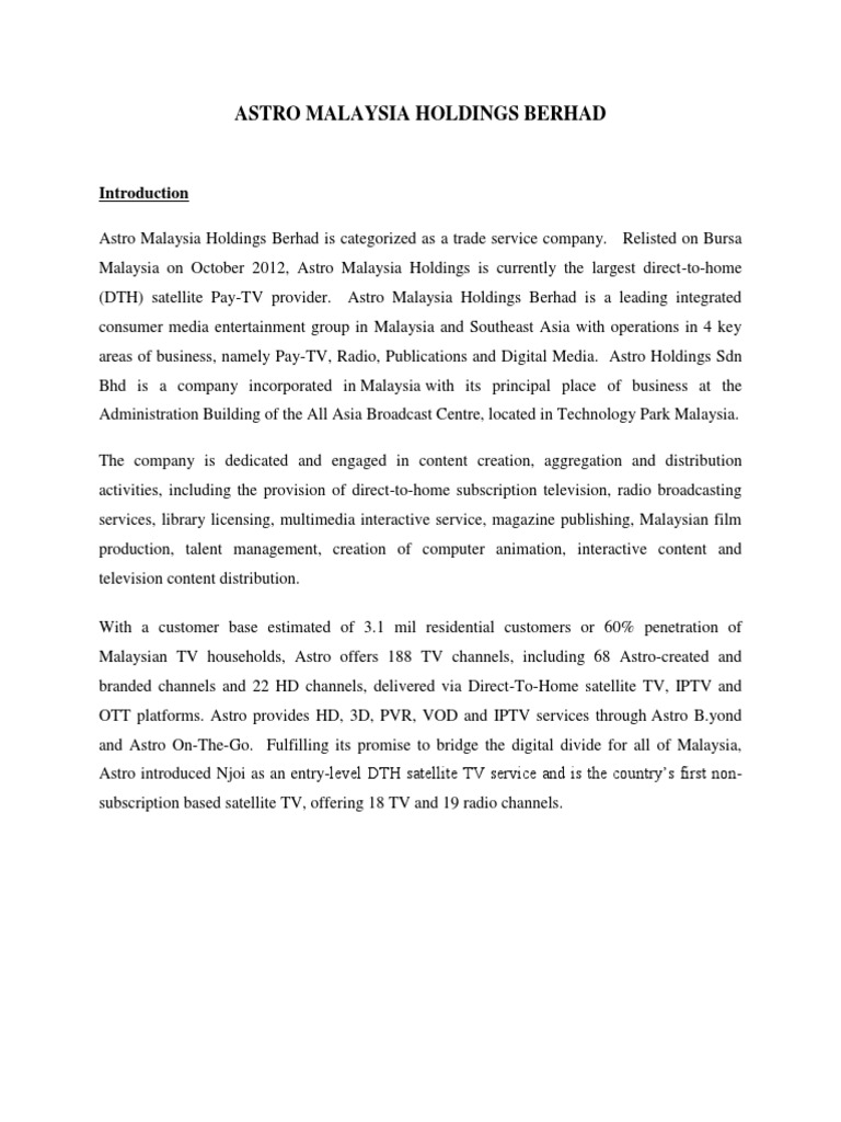 Astro malaysia holdings berhad segments its business into four main categories; The company is engaged in the provision of television services, radio services, film library licensing, television content, creation, aggregation and distribution, magazine publication and distribution. The initial public offering (ipo) consists of 1.52 billion shares at an indicative ipo price of rm3.00 per share. The company is owned by astro holdings sendirian berhad, which also owns astro overseas limited. Latest astro malaysia holdings berhad uploads. Astro malaysia holdings berhad 2019; The company is owned by astro holdings sendirian berhad, which also owns astro overseas limited. Astro malaysia holdings berhad, an investment holding company, operates as a content and consumer company in malaysia and internationally. Astro malaysia holdings berhad (6399.kl). Malaysian communications and multimedia commission 2018b. 6399) is a malaysian media and entertainment holding company that began as a paid digital satellite radio and television service, astro. As a trusted brand, astro keeps malaysians entertained and informed with a variety of vernacular. Astro malaysia holdings (myx :