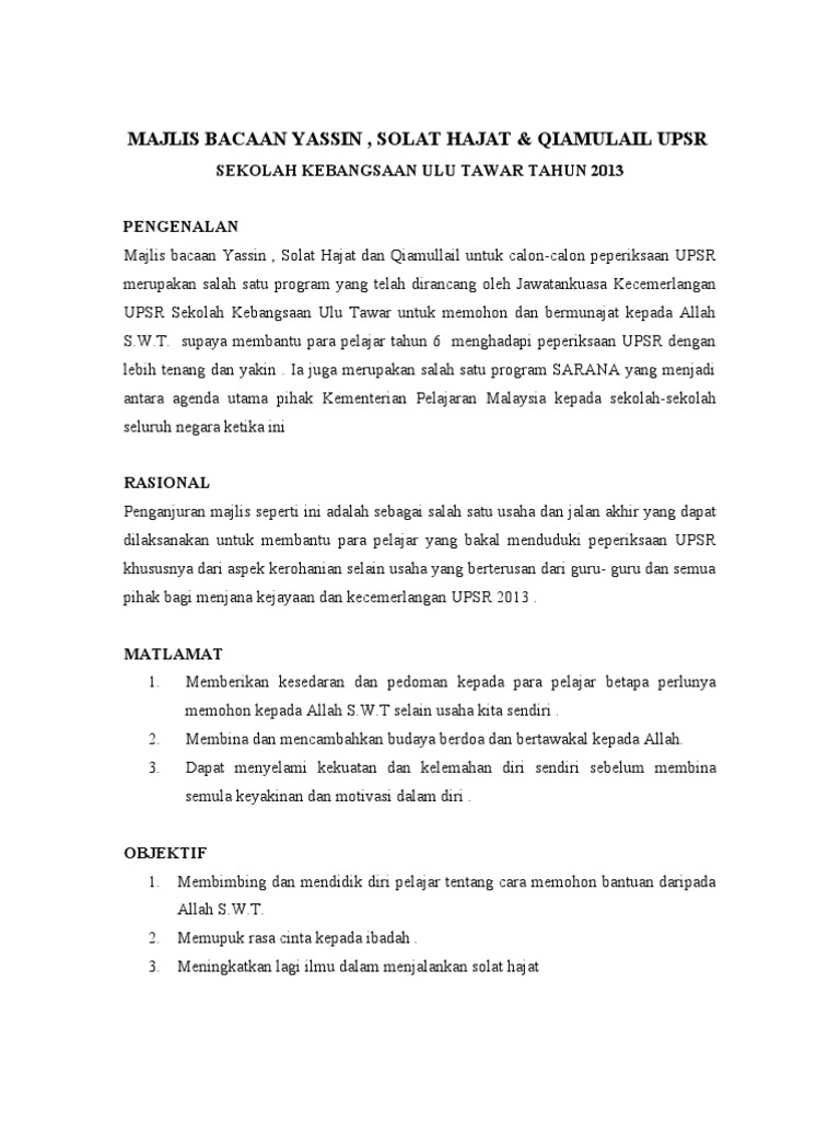 Sholat hajat adalah sholat sunnah yang dikerjakan ketika kita memiliki masalah atau keinginan tertentu. Bagi anda yang ingin tahu bagaimanakah. Sehingga tidak sedikit juga ada di antaranya yang hendak mengerjakan sholat sunnah hajat harus menunggu malam datang. Tata cara sholat witir tiga rakaat ada dua macam. Program solat hajat & bacaan yasin upsr sk paris 3 2012. Kertas kerja (working paper) merupakan mata rantai yang menghubungkan catatan klien dengan laporan audit. Jumlah rakaatnya bisa 2 sampai 12 rakaat dengan salam di tiap 2 rakaat. Kertas kerja program bacaan yasin & solat hajat upsr. Pendahuluan program solat hajat & bacaan yasin ini merupakan salah satu pengisian di dalam program kecemerlangan upsr 2012. Shalat hajat jika dilakukan sebanyak 12 rakaat, setiap 2 rakaatnya diakhiri dengan salam. Sholat tersebut yang dinamakan sholat hajat. Sholat hajat adalah ibadah sholat yang dilakukan ketika seseorang memiliki suatu keinginan ataupun hajat. Panitia pendidikan islam sk paris 3.